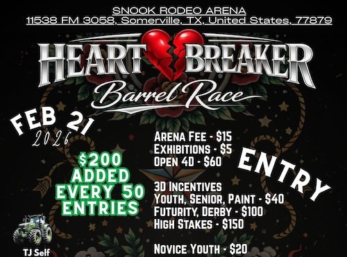 Posted on January 30, 2026January 30, 2026 by tametHeart Breaker Barrel Race Feb 21st Online Entries Open Feb 16th-18th Share this:Tweet Share on Reddit (Opens in new window) Reddit Share on Tumblr Print (Opens in new window) Print Email a link to a friend (Opens in new window) Email PostLike this:Like Loading...