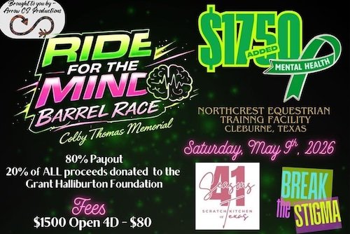 Posted on April 17, 2026 by tametRIDE For the MIND Barrel Race Colby Thomas Memorial Online Entries Open May 4-7